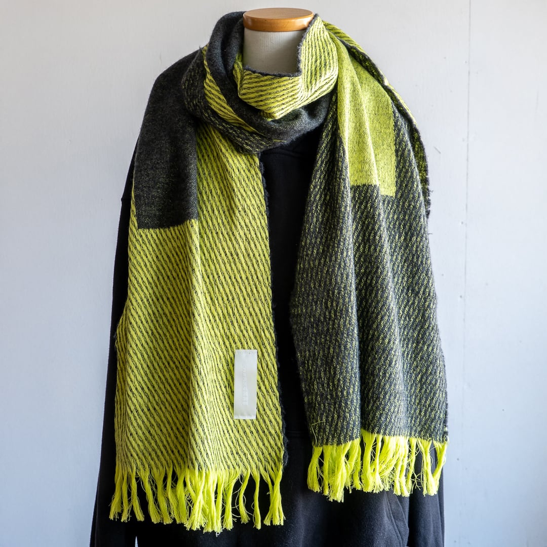 モダンなネオンカラーが印象的なストール。素材は天然繊維100%で柔らかく、驚くほど軽いのが特徴です。その秘密は細番手のコットンとフェルト化したウール素材。空気を含んで温かい、この冬におすすめの1枚。たっぷりした長さのため、ぐるぐる巻いても、ストンと落としてもスタイリングが決まります。